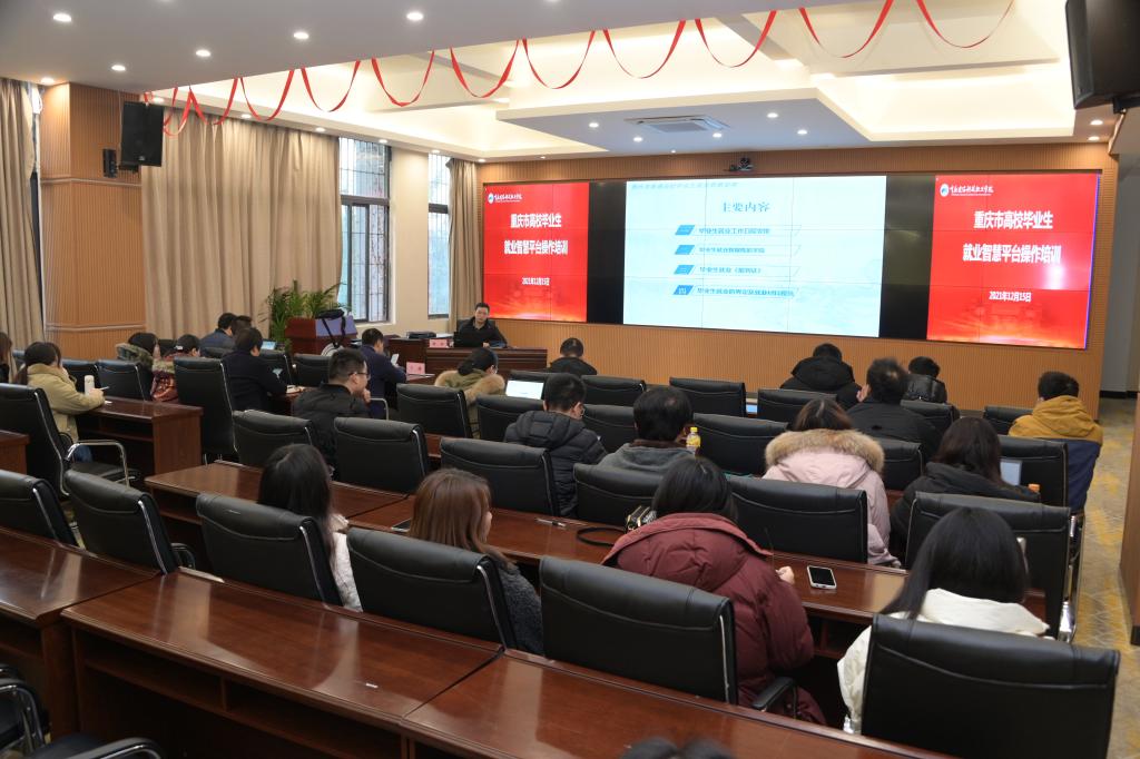 2021年12月15日上午,重庆市大学中专毕业生就业指导服务中心信息与市场部副部长卜靖和主管黄新,在beat365立德楼二楼大数据中心会议室到作了关于“重庆市普通高校毕业生智慧就业平台”专题培训讲座。