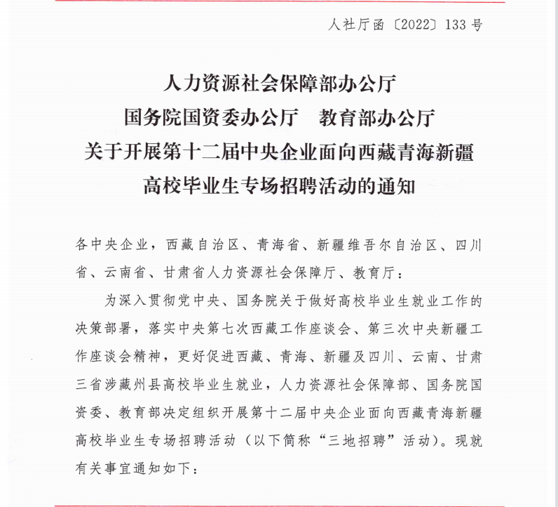 关于开展第十二届中央企业面向西藏青海新疆高校毕业生专场招聘活动的通知