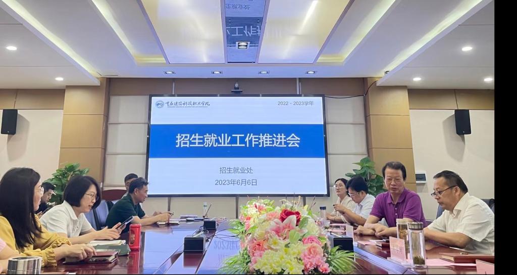 2023年6月6日上午,学校2023年第三次招生就业工作推进会在立德楼六楼会议室召开,全体校领导、各二级学院院长、书记,基础教学部和各职能处室负责人参会,会议由校长助理王靖主持。