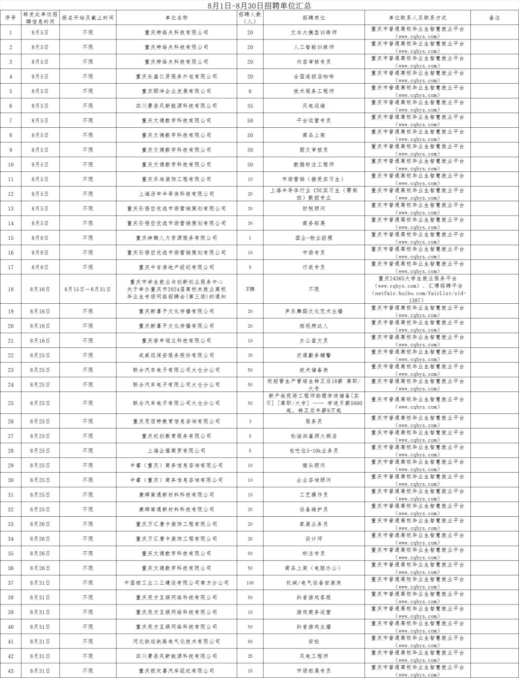 8月1日-8月30日招聘单位汇总