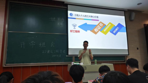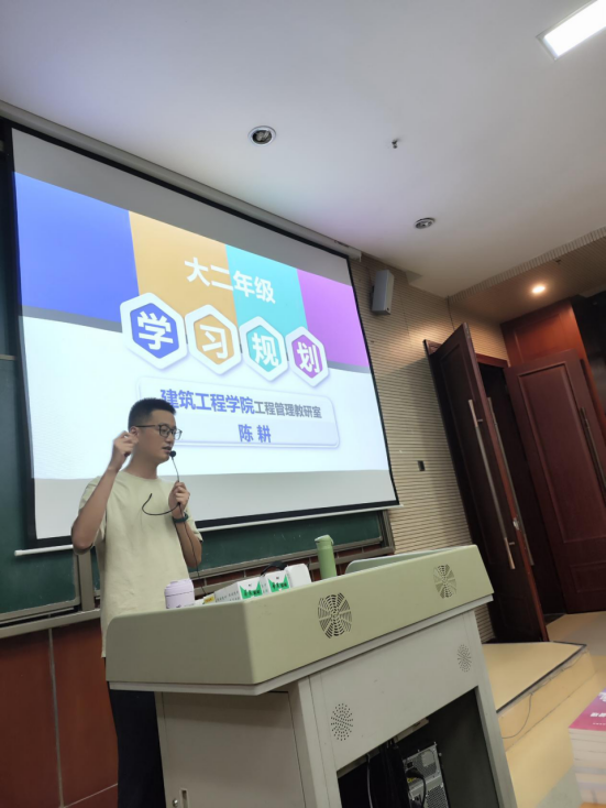 随后,工程管理教研室陈耕老师提醒大家:在学习过程中,同学们应认真上课、多参加活动和比赛以获得经验,积累学分。而建设工程管理分为技术、基础管理、进阶管理三个方面,学生应根据自己的情况合理选择就业方向。在这之后,陈耕老师又给同学们讲解了专业毕业需要获得的技能证书,毕业设计和毕业答辩通过条件等,提醒同学们合理准备。