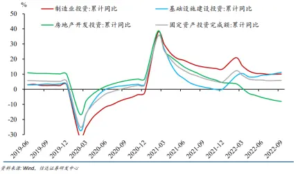 具体来看,固定资产投资结构分化明显,前三季度制造业投资同比增长10.1%,增速保持在相对高景气水平;地产开发投资同比下降 8%,依旧持续拖累整体下行;基建投资持续发力,同比增长11.2%,整体继续回升。基建在经济衰退时期起到的拉动经济增长的作用明显,成为“稳增长”的重要抓手,基建大概率会维续较为强势的态势。