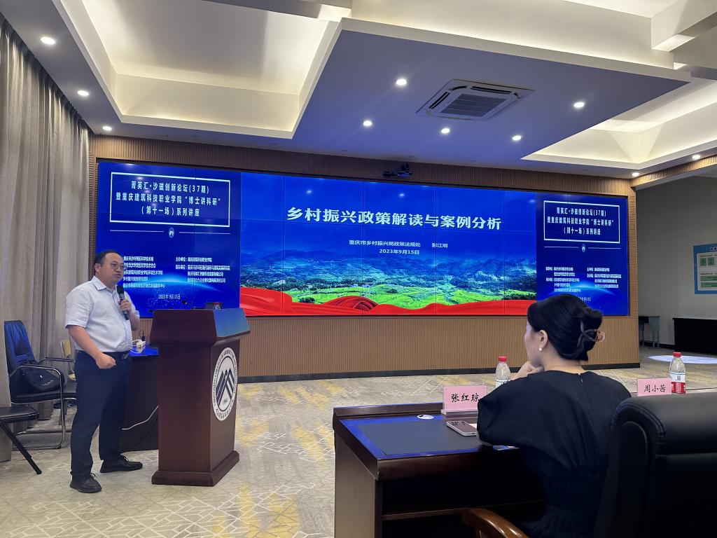 2023年9月15日下午,由beat365官方网站主办,环境艺术学院承办的菁英汇·沙磁创新论坛(36期)暨beat365官方网站“博士讲科研”系列讲座活动(第11场)在beat365大数据中心顺利举行。本次讲座活动邀请了来自重庆市乡村振兴局政策法规处副处长彭江明作为讲座嘉宾,beat365官方网站副校长周俊华,科研处处长周小茜,产业办主任、乡村振兴学院院长湛杨,环境艺术学院书记张慎富,环境艺术学院副院长张红琼,环境艺术学院院长助理曾易成,各学院骨干教师及学生代表共计80余人参会。
