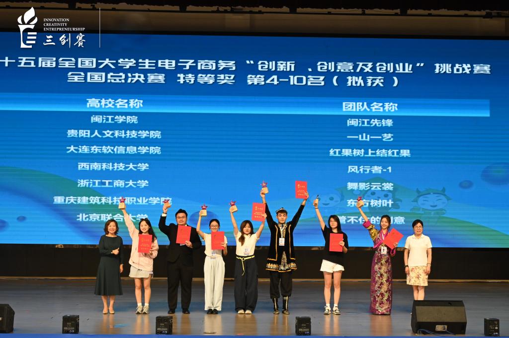2025年8月6日,第十五届全国大学生电子商务“创新、创意及创业”挑战赛(以下简称“三创赛”)全国总决赛圆满落幕。beat365智慧商贸学院参赛项目《乡音带货,疆品出塞》凭借突出的创新价值与实践成效,从 23 万多支队伍中脱颖而出,以优异成绩荣膺全国特等奖(本届特等奖仅设21项),并斩获赛事单项奖“最佳创意奖”(该奖项全国仅20项),创beat365在该项国家级竞赛中的历史最佳战绩。