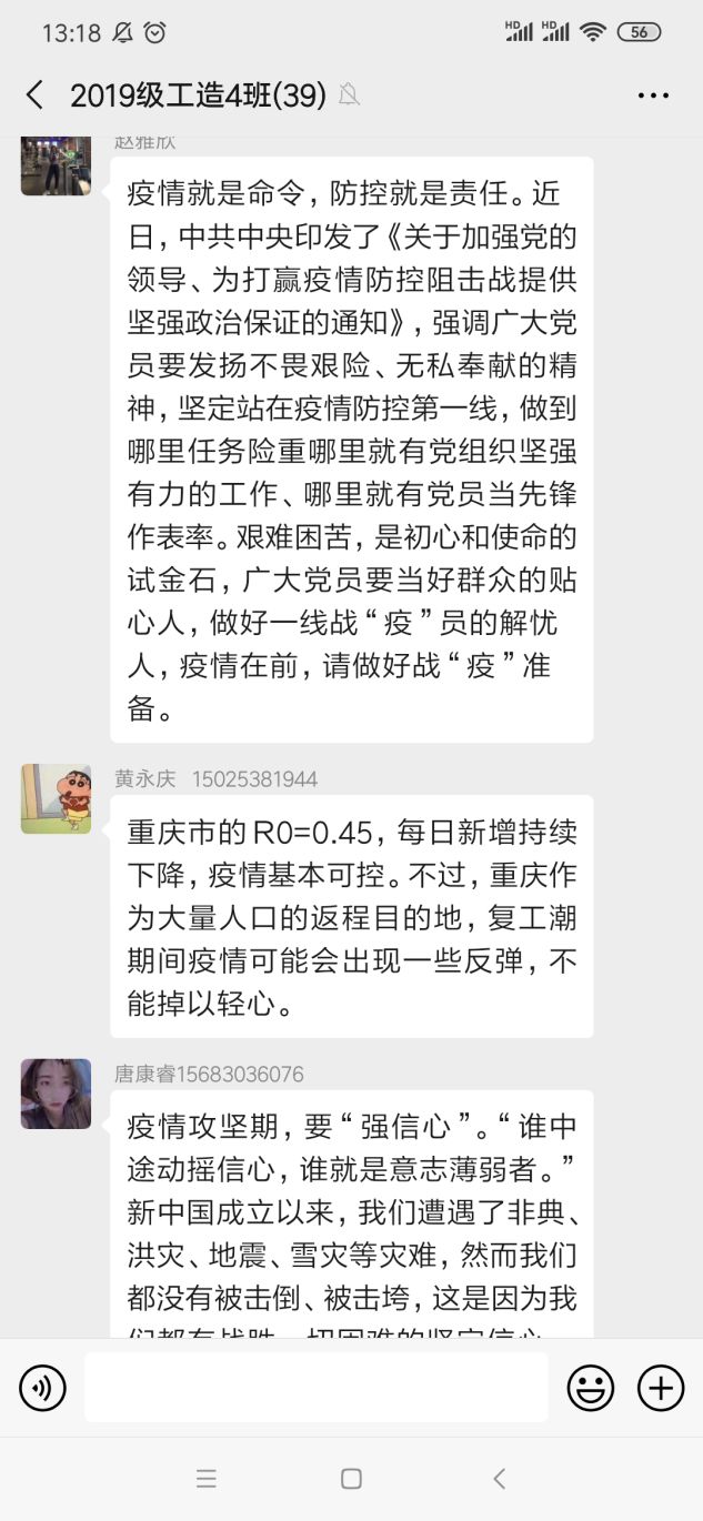 自新冠肺炎疫情发生以来,“最美逆行者”84岁高龄的钟南山院士、“70”后李兰娟院士分别带领团队奔赴武汉,无数的医护人员、共产党员、志愿者们临危受命冲战在防疫第一线,在这场没有硝烟的战争中,中华民族万众一心用行动谱写了一曲曲感人篇章,一首首壮丽诗歌,这是爱国主义、民族精神的体现,更是对社会主义核心价值观的践行。为进一步加强青年学子的思想引领,培育爱国情怀和社会责任感,引领青年靠拢组织,情系“疫”线,学校各基层团组织于2020年2月28日开展第二期线上特色主题团日活动。各级团组织高度重视、精心组织,认真筹备,紧紧围绕“学‘习’防‘疫’、“‘疫’起坚守,致敬最美逆行者”、“疫情中的青春思考—我与祖国共呼吸”、“我是团员,我承诺”等主题,深入学习贯彻落学习近平总书记关于打赢疫情防控阻击战的重要指示精神,同时响应教育部党组关于在教育系统扎实开展爱国主义教育的发文,利用“疫情防控”这堂爱国主义教育大课,教育引导广大师生从感性到理性、从自在到自为,激发爱党爱国爱社会主义的巨大热情,凝聚奋进新时代、实现民族复兴的磅礴伟力。