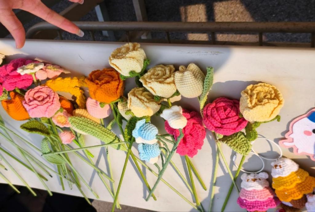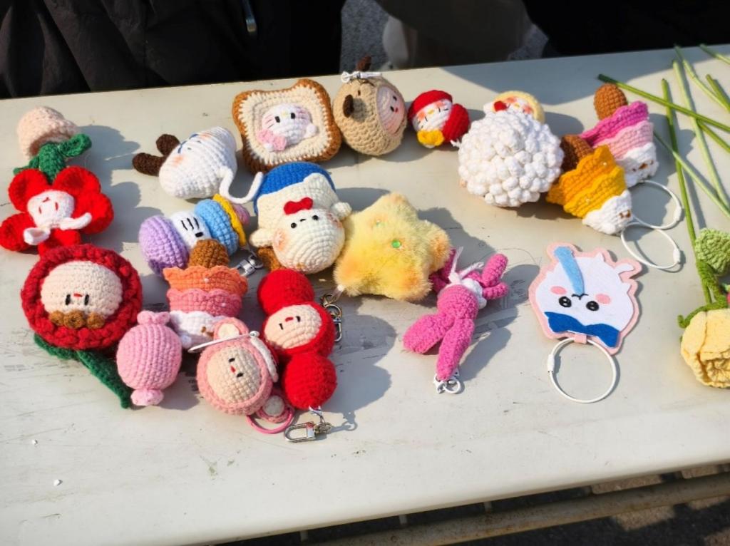 同学们精心布置的摊位,各种文具、玩具和手工艺品琳琅满目。现场制作的手工艺品,如编制挂件等,吸引了众多目光。