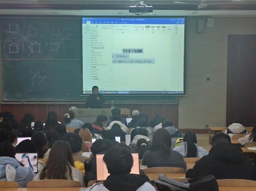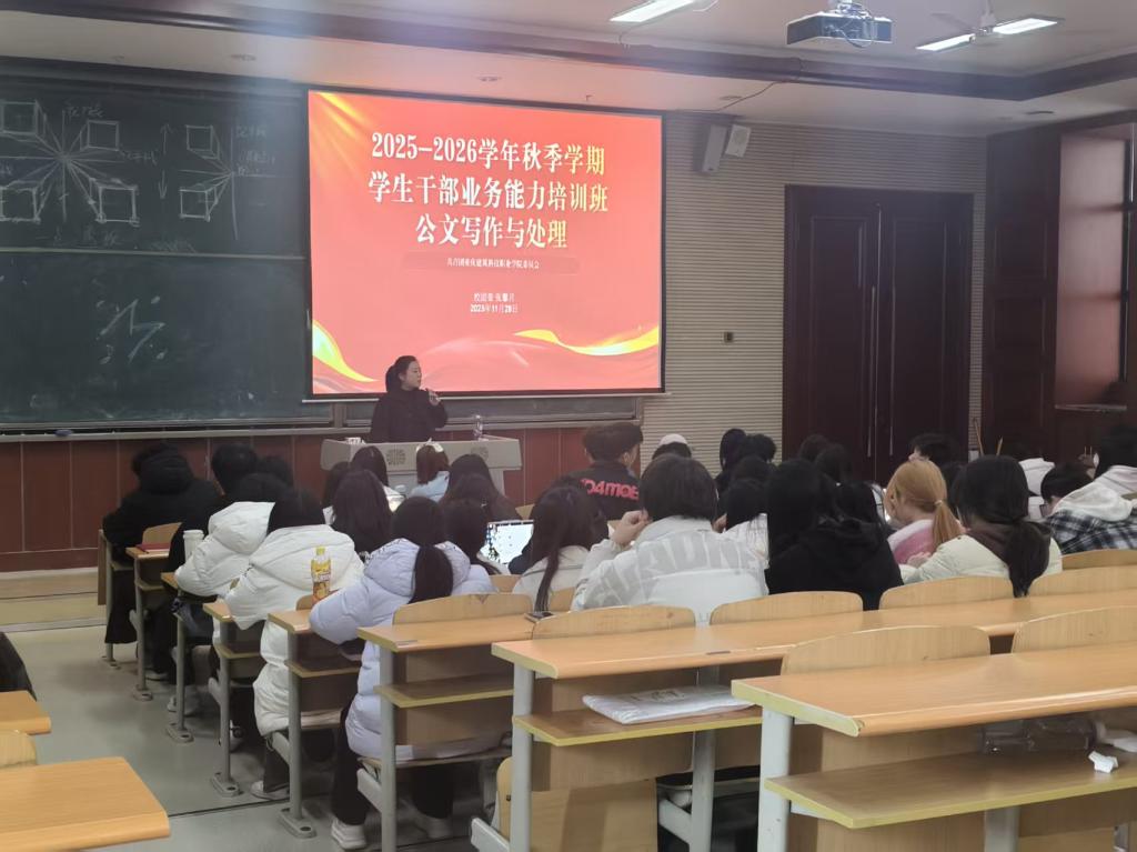 为进一步提升学生干部的综合素质和业务能力,规范日常工作中的公文写作与处理流程,校团委于11月28日下午1点,在笃学楼1305教室成功举办了学生干部业务能力培训第二讲。本次培训特邀校团委张馨月老师担任主讲,围绕“公文写作与处理”这一核心主题展开了深入讲解,各学生组织、院系学生干部代表积极参与了此次培训。