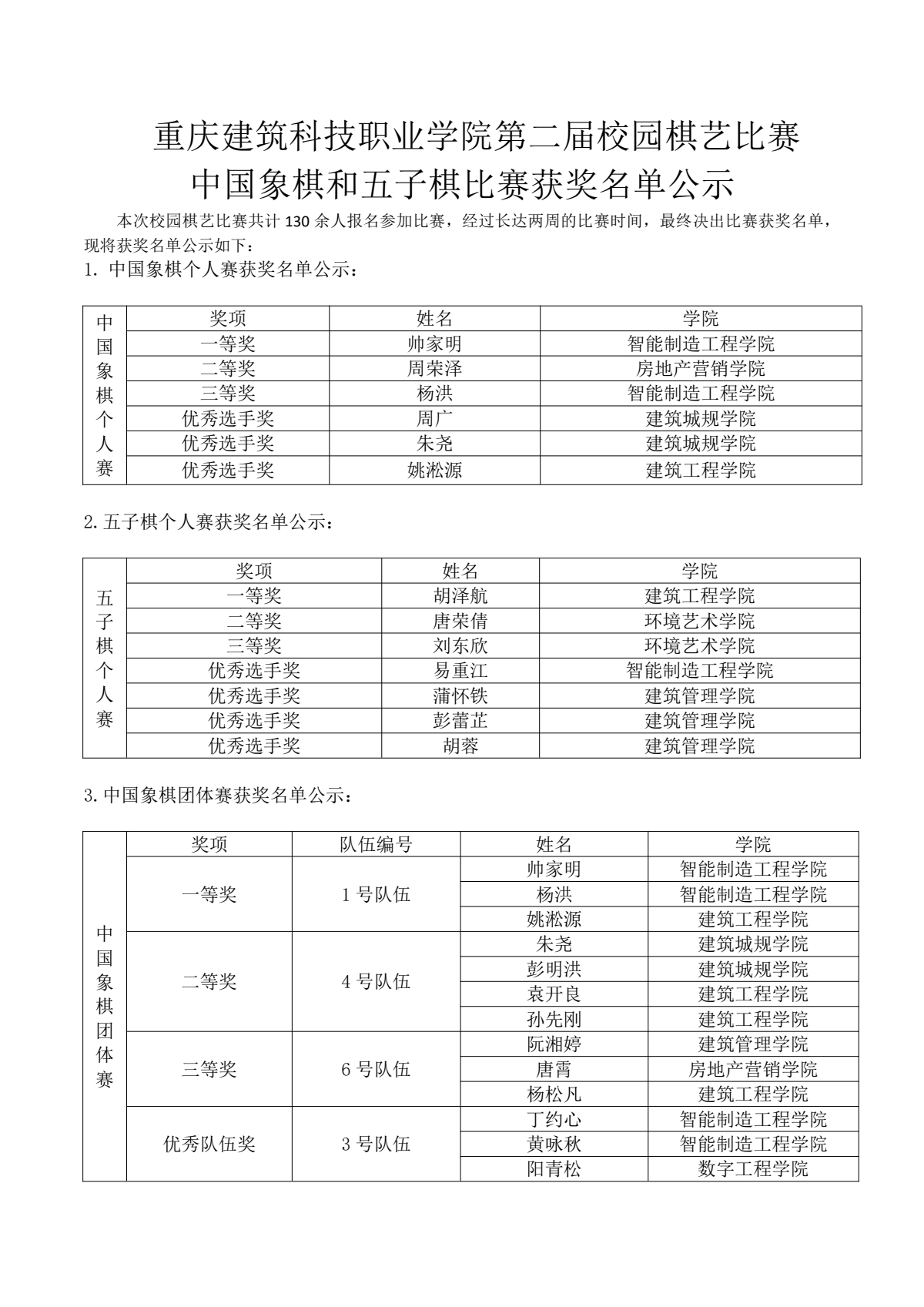 此次比赛于12月8日开始个人赛初赛的角逐,12月10日开始团体初赛竞争。12月15日如期举行个人决赛17日开展团体决赛。参与人数达130余人,历时15日,在2021年12月22日下午13:00由棋社社长帅家明作为主持人,邀请社团指导祝林源老师为获奖选手及队伍颁奖。