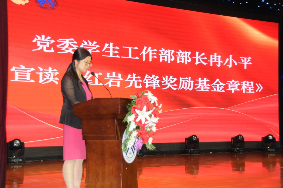 首先是党委学生工作部部长冉小平宣读《红岩先锋奖励基金章程》。提到为全面贯彻落实党的二十大精神,大力弘扬伟大建党精神和红岩精神,激励广大青年学生珍惜革命先烈用鲜血换来的美好生活,努力学习,刻苦专研,扎实推动学校主题教育走深走实、彰显“红岩味”。结合学校实际,特设立“红岩先锋奖励基金”。