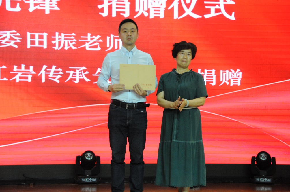 接着由校团委田振老师代表学校接受陈鼎华烈士亲属陈伦华女士对学校“红岩传承先锋”的捐赠。然后学校党委副书记李果为陈伦华女士颁发《捐赠证书》。