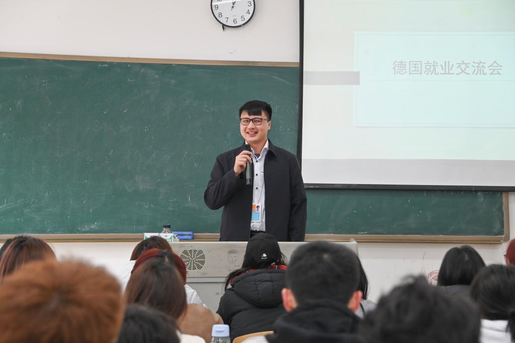 签约仪式前,曾平戈为智能建造学院学生举办专题分享会,结合自身通过校际项目赴德就业创业的实践经验,系统解析德国留学政策与就业环境,并强调职业规划的前瞻性,激发学生国际化发展意愿。