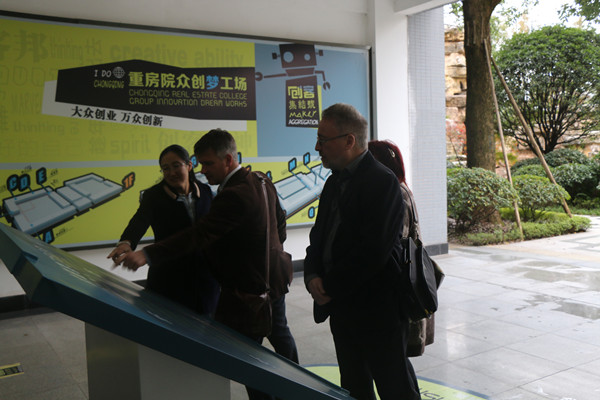 对外合作处王靖带领Carleen Houbart一行参观校园重点介绍了图书馆、建筑科技馆及众创梦工厂。