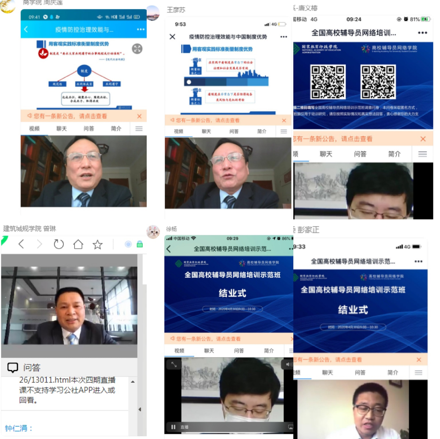 网络课程学习中,老师们运用手机、电脑端等多媒体参与线上学习,充分利用直播课程的线上交流机会,积极参与直播探讨,及时提出工作中的困惑,巩固自己的学习成效。同时也在论坛中围绕“如何做好疫情期间青年学生的思想政治工作”、“如何对当代青年学生进行爱国主义教育”、“如何有效利用新媒体平台做好网络思想政治教育”等主题进行研讨。
