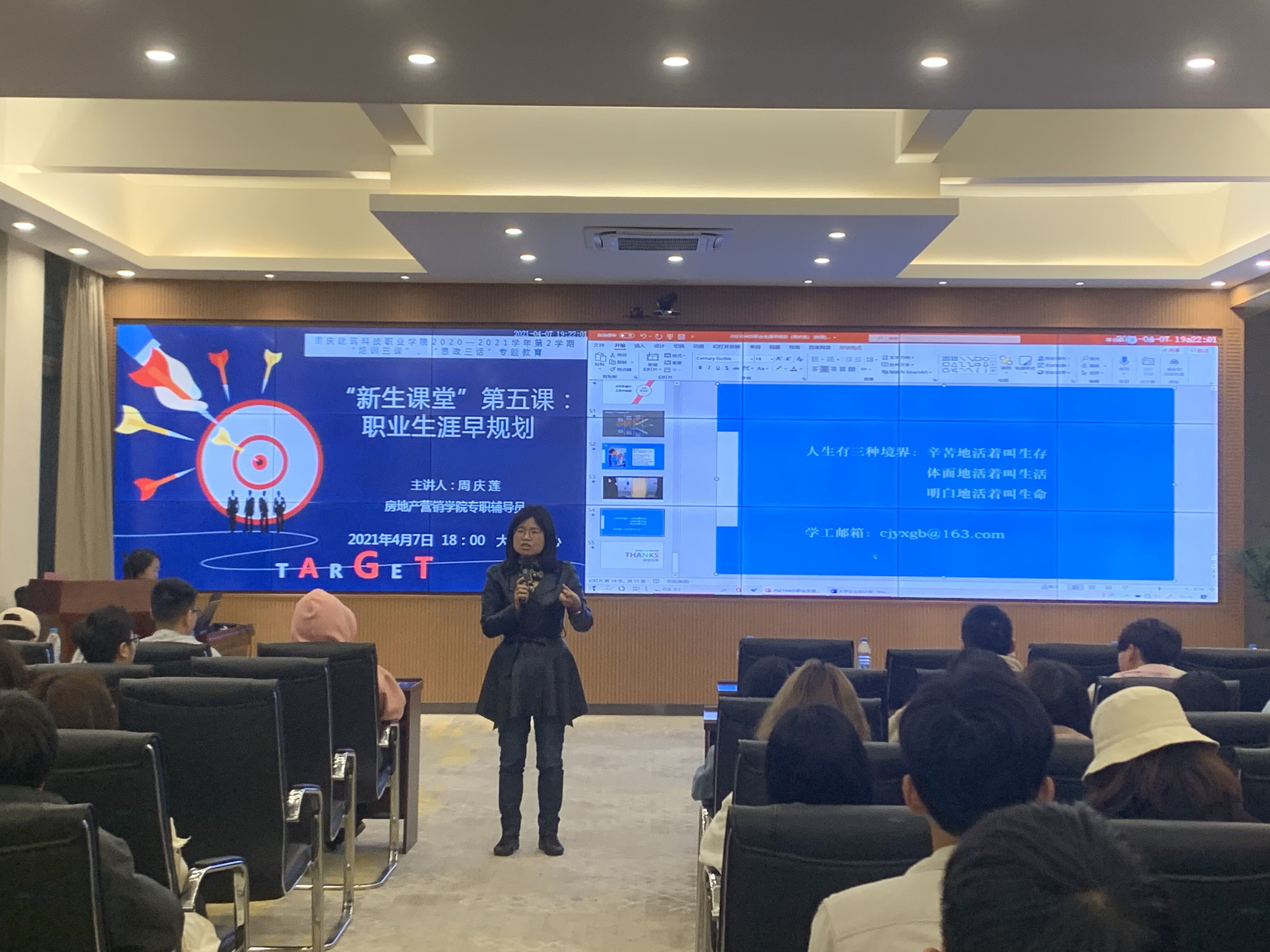2021年4月7日18:00,由学校学工部组织的“新生课堂”第五课:职业生涯早规划在大数据中心开讲,由房地产营销学院辅导员周庆莲为大家主讲,学工部部长冉小平、学工部老师及2020级学生代表到场聆听。