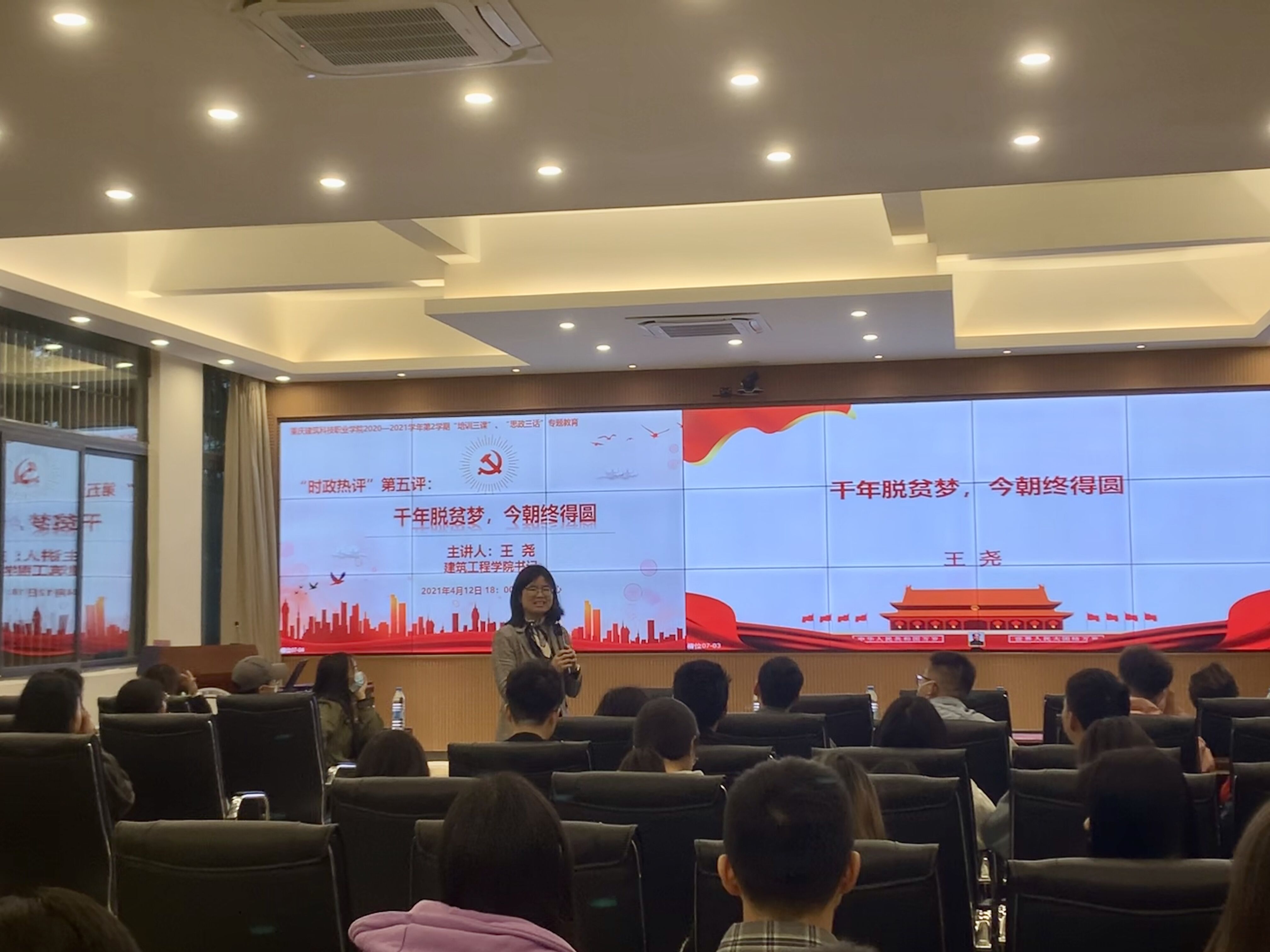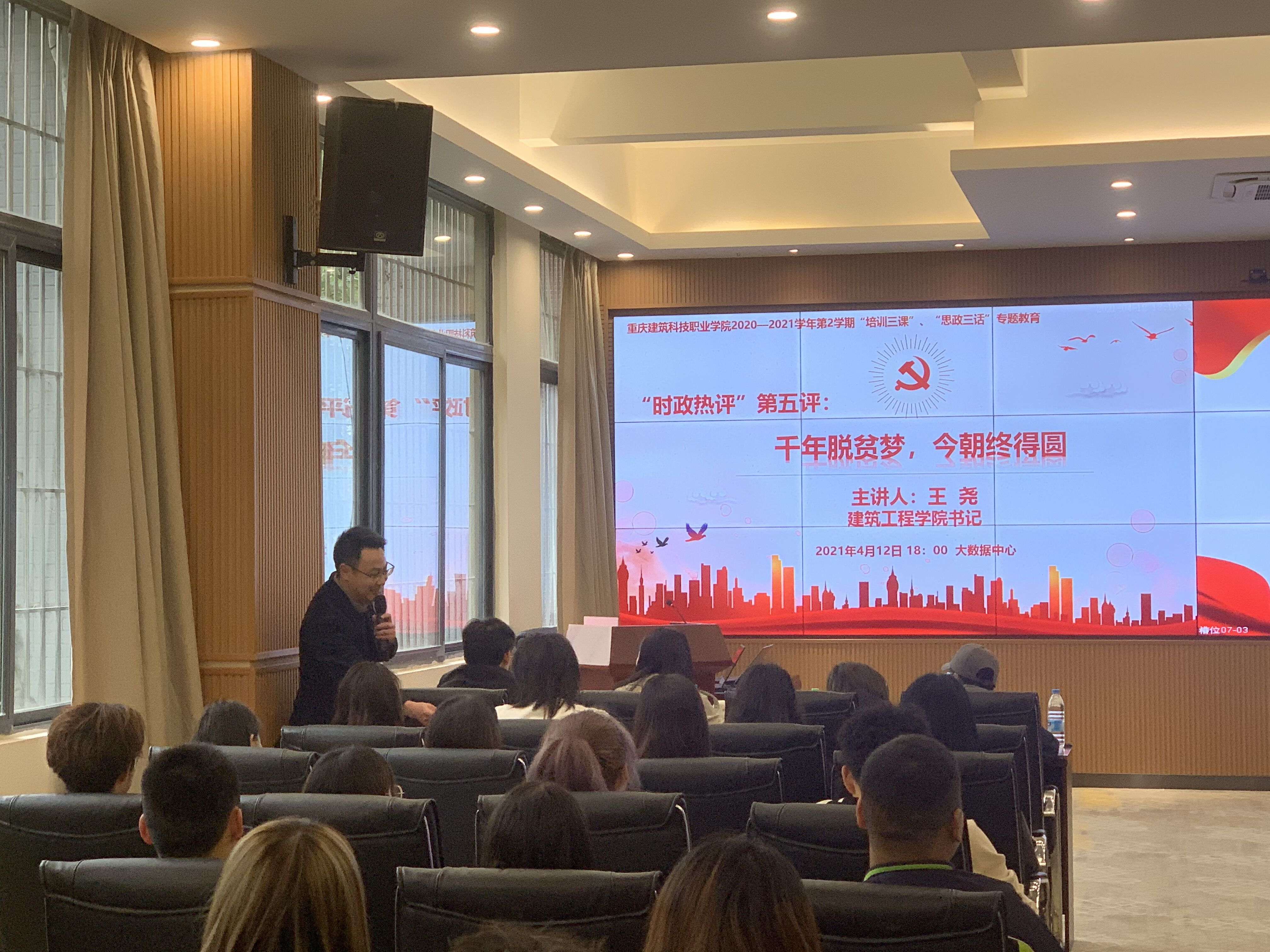 为贯彻落实全国脱贫攻坚总结表彰大会上讲话精神——我国脱贫攻坚战取得了全面胜利,巩固拓展脱贫攻成果,2021年4月12日,beat365党委学工部在大数据中心举办了“时事热评”第五评:千年脱贫梦,今朝终得圆的专题讲座。此次讲座由建筑工程学院书记王尧主讲,学校副校长李果、学工部部长冉小平、智能制造工程学院书记齐云霞、辅导员代表、学生骨干代表共同参加。