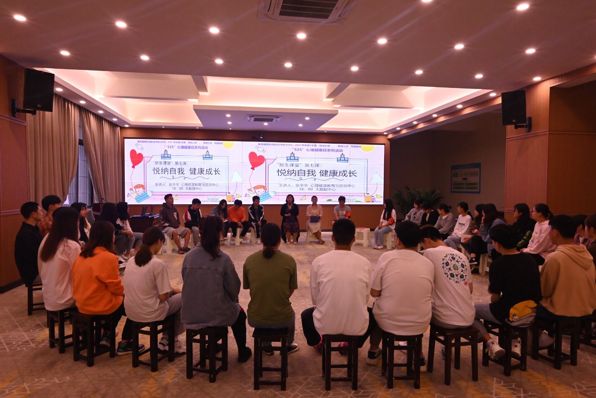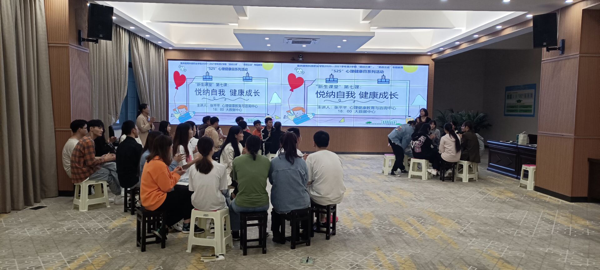 5月25日是全国大学生心理健康日,“525”谐音“我爱我”,意在提醒大学生“珍爱生命,关爱自我”。为营造校园健康成长氛围,教导学生悦纳自我能力2021年5月25日校党委学工部在大数据中心开展新生课堂”第七课:悦纳自我,健康成长团体辅导活动。本次活动的主讲人是心理咨询中心的张平平老师,学校副校长李果、学工部部长冉小平、辅导员代表、学生代表共同参与。