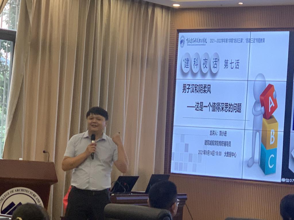 为培养学生勇敢坚毅的品格、血性阳刚的气魄;防止学生精神上的迷茫、心理上的脆弱、责任感的缺失和尚武精神的消退。beat365学工部于9月14日18:00在大数据中心开展了“建科夜话”第七话:男子汉和阴柔风——这是一个值得深思的问题专题讲座。本次讲座由建筑城规学院辅导员刘小进主讲,学校副校长李果、学工部部长冉小平、各二级学院书记、辅导员及学生代表共同参与。