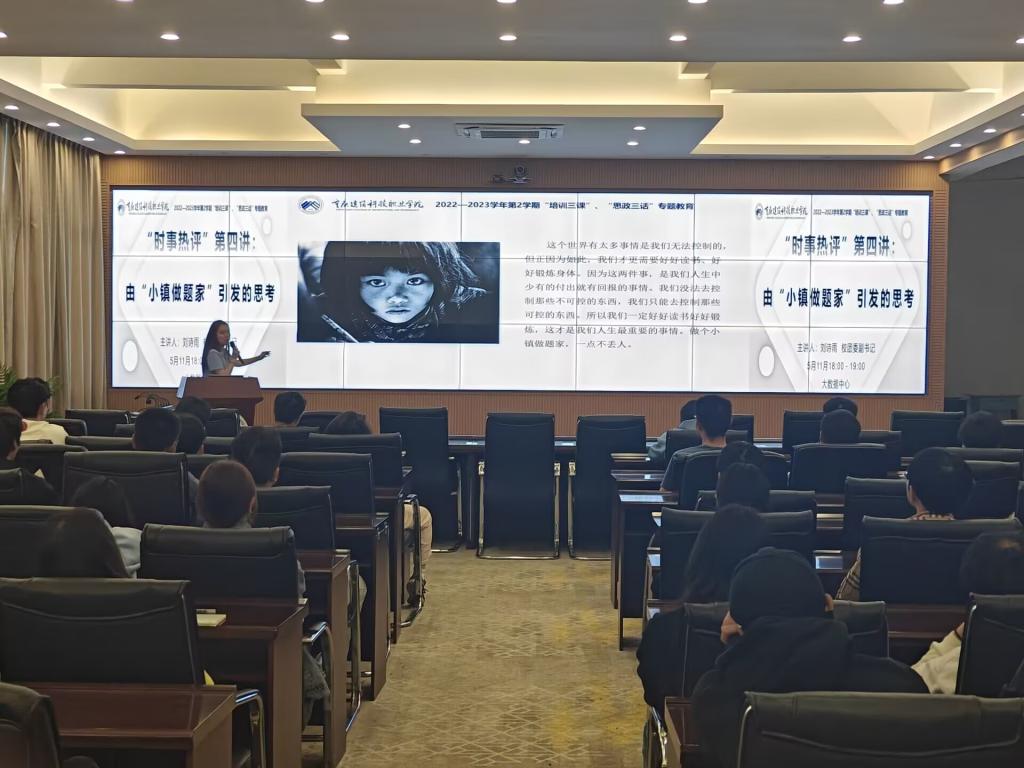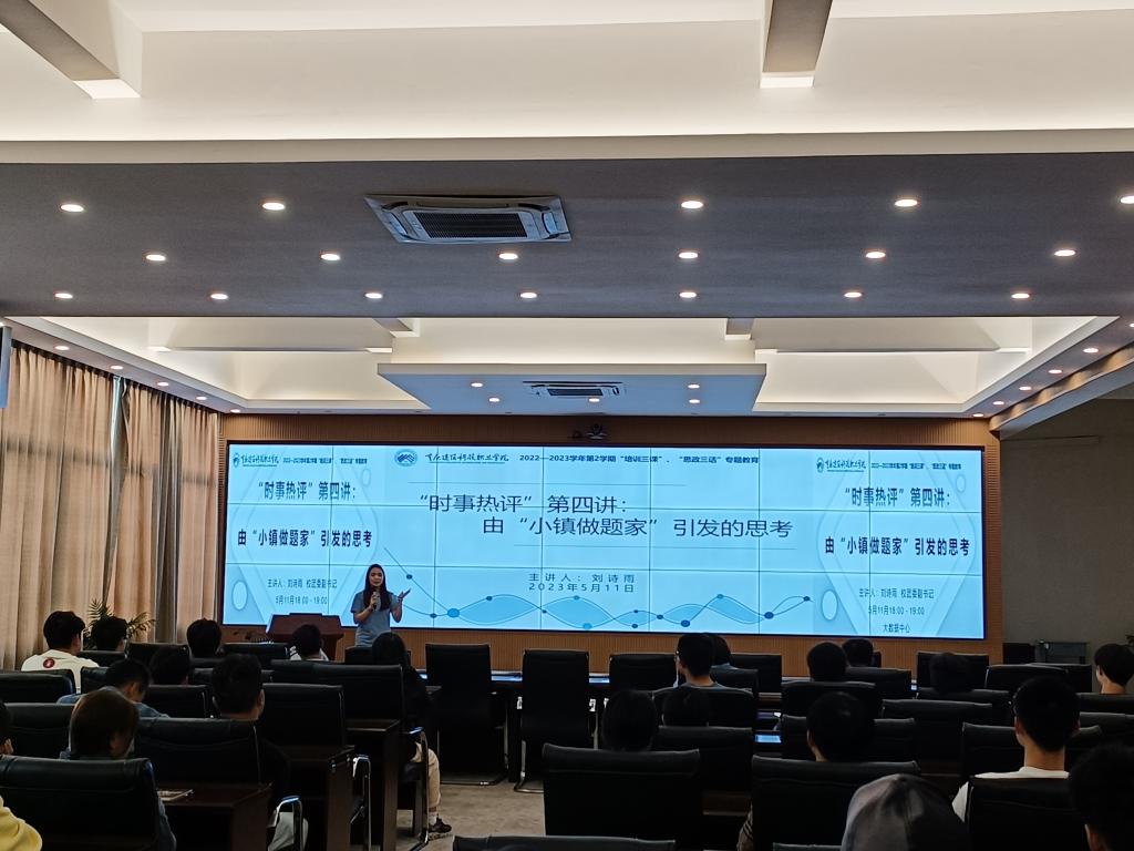 2023年5月11日18:00,学校学工部组织的“时政热评”第四讲专题讲座在大数据中心举行,校团委副书记刘诗雨以“由‘小镇做题家’引发的思考”为题进行讲座,值班书记、专职辅导员以及在校学生代表共80人参与。