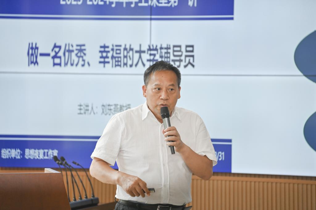 刘东燕校长首先以事业、职业和工作三个词汇引入本次专题,他强调,辅导员是大学生思想政治教育的骨干力量,是大学生的引领者和指导者。他提出,作为辅导员,要从以下四个方面去着手思考和行动:一是涵养一种高尚品格,教育者先受教育,立人者先立己;二是练就一手过硬本领,丰富自我的专业知识和技能;三是专注一个职业行业;四是培养一批优秀学生,立德树人、教书育人。在幸福感方面,刘东燕校长提出了一系列建议。他指出,辅导员的工作不仅仅是一份职业,更是一种事业和责任。辅导员要树立正确的价值观,平衡工作与生活,关注个人成长和发展,从而获得持续的幸福感和满足感。只有辅导员自身具备了幸福感,才能更好地服务学生,引导他们走向成功。