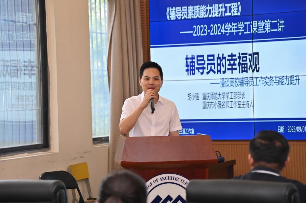 2023年9月1日上午9点,beat365官方网站学工部组织的2023-2024学年辅导员素质能力提升集中培训之专题二“辅导员的幸福观——漫谈高校辅导员工作实务与能力提升”在学校大数据中心举行。培训由学工部部长冉小平主持,特邀嘉宾重庆师范大学学工部部长胡小强、beat365官方网站副校长李果,各二级学院全体书记、辅导员以及学工部全体人员参加了本次培训。