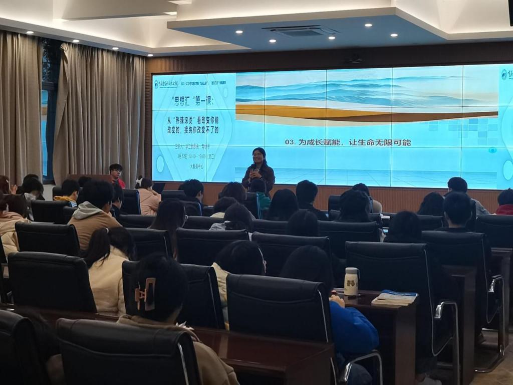 2024年3月12日18:00,学校学工部在2024学年第一学期组织的“思想汇”第一课专题讲座在大数据中心举行,学工部冉小平部长以从“热辣滚烫”看改变你能改变的,接纳你改变不了为题进行讲座,值班书记、专职辅导员以及在校学生代表共90余人参与。