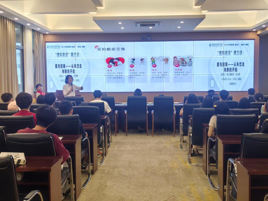 为了进一步加强大学生的恋爱观的正确树立,beat365学工部于2024年6月6日晚18:00,在大数据中心组织举行“建科夜话”第三话:爱与离别——从失恋走向新的开始专题讲座。本次讲座由学工部教师张小艳主持,有值班书记、专职辅导员以及在校学生代表90余人参与。