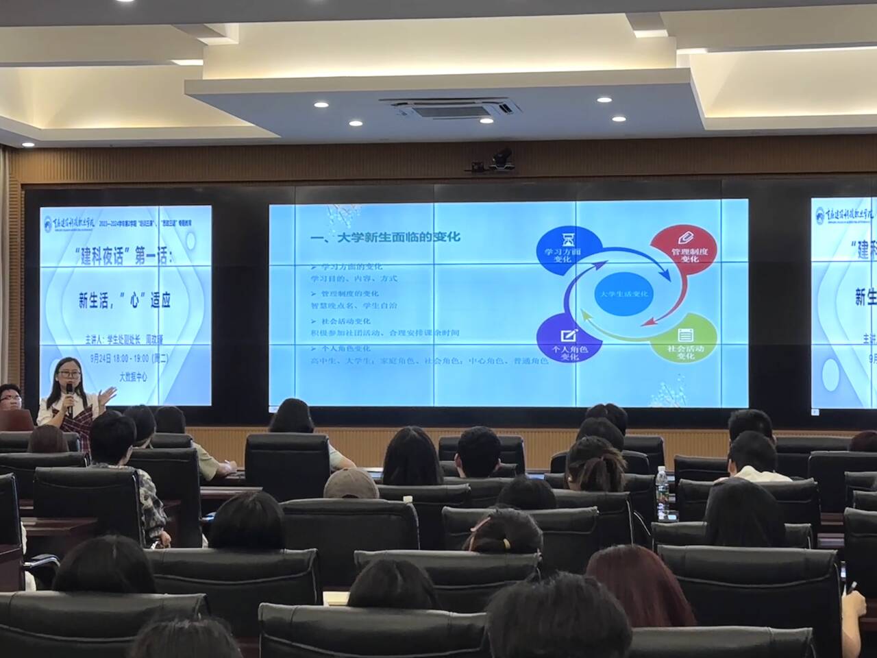 为让新生更好、更快适应新学期,beat365学工部于2024年9月24日下午18:00,在大数据中心组织举行2024学年“建科夜话”第一话:新生活,心“适应”专题讲座。本次讲座由学生处教师周玟瑾主持,有在校新生代表90余人参加。