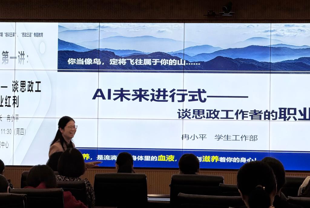 2024年10月11日上午10:00,学工部组织2024-2025学年第一学期“学工课堂”第一讲:AI未来进行式——谈思政工作者的职业红利专题讲座在大数据中心举行,由学工部部长冉小平主讲,全体书记、专职辅导员共60余人参与。