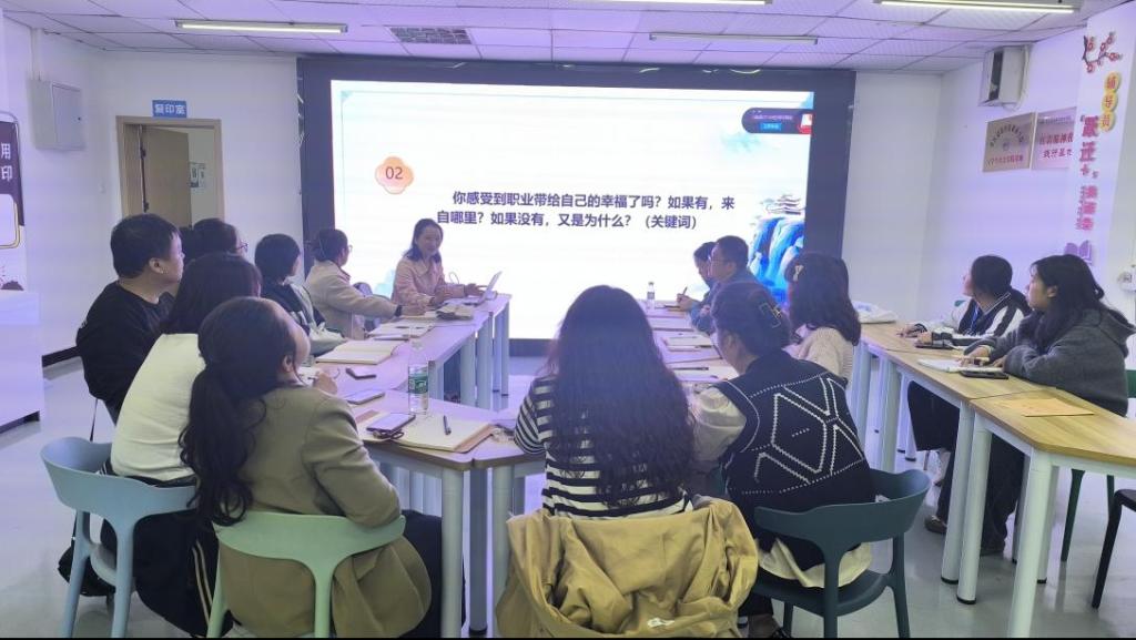首先,主持人向老师们提出了职业幸福感,说明了老师的职业幸福感处于第三位,是职业幸福感相对较高的职业。然后,主持人以三个问题导入,分享了自己是如何在工作中推动自己前进,获得职业幸福感的。同时,主持人以苏轼的视频,分享了他一生的经历与苦难,表明无论任何地方,任何岗位,何种境界,调节自我,适应环境以及乐观豁达的心态,让他熬过了人生的大起大落,这也体现了转念的力量。