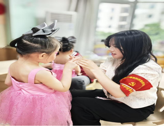 活动当天,志愿者们怀着饱满的热情早早来到幼儿园,他们化身“魔法造型师”,穿梭在孩子们中间,用专业且轻柔的手法为孩子们精心装扮。描绘眉眼时专注认真,轻扫腮红时温柔细致,在志愿者们的巧手下,孩子们变得更加俏皮可爱,纯真的小脸上洋溢着自信与对表演的期待。