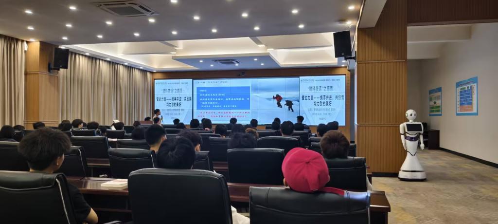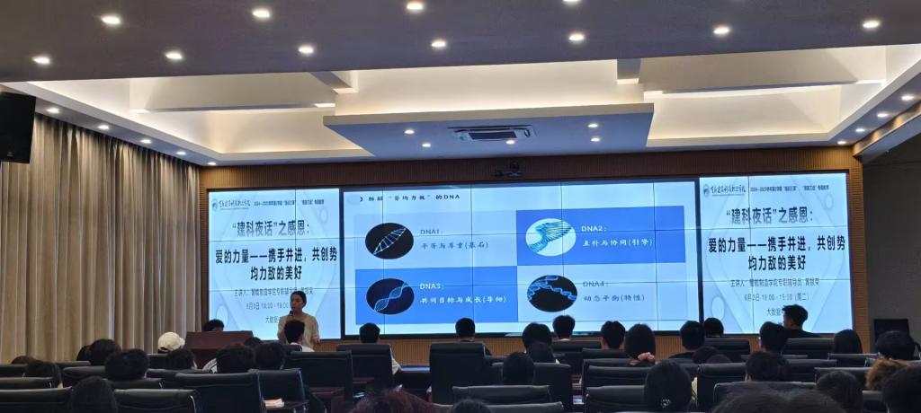 2025年6月3日下午18:00,学工部组织的2024-2025学年第二学期“学工课堂”第三讲:“建科夜话”之感恩:爱的力量——携手并进,共创势均力敌的美好的专题讲座在大数据中心举行,由智能制造学院专职辅导员黄银荣主讲,值班书记、辅导员以及在校学生代表共90余人参与。
