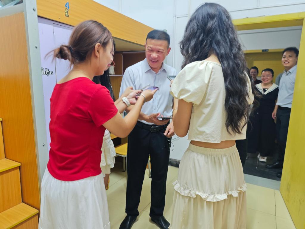 “同学们从哪里来?”“报到过程还顺利吗?”“食堂的饭菜还合口味吗?”“生活上还有什么困难?”每走进一间宿舍,张校、李校都与新生们进行亲切交谈,细致地询问同学们的生源地、入学感受、专业选择以及对校园环境的适应情况,耐心倾听同学们初入大学的所思所感,并现场解答同学们关于学业规划、校园生活等方面的疑问。在A、C、E栋宿舍和高层公寓楼,张校与来自五湖四海的同学们围在一起,亲切话家常。他勉励同学们要尽快完成角色转变,适应大学的学习和生活节奏,珍惜宝贵的大学时光,做好学业规划,打牢专业基础,同时也要注重全面发展,积极参与校园文化活动和社会实践,提升综合素养。他特别叮嘱同学们要互相关心、互相帮助,建立深厚的同窗情谊,共同营造团结友爱、积极向上的宿舍氛围,并与同学们互加微信好友。