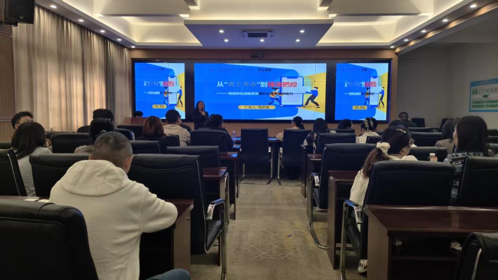 2025年10月23日下午14:00,由学校学工部组织的2025-2026学年第一学期“学工课堂”第一讲:从“疲于奔命”到精准把控——用结构化战略思维提升处理事情的能力专题讲座在大数据中心举行。本次讲座由智慧商贸学院学工办主任兼团总支书记周庆莲主讲,全体书记、辅导员及学工部全体成员共60余人参与。