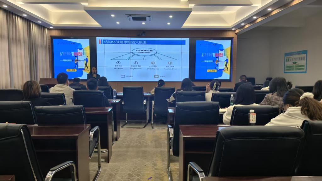 讲座开始,周老师通过“辅导员九月工作节奏”视频与数字记忆对比实验,直观揭示“做事无计划、被事务牵着走”的常见痛点,引出核心概念——结构化战略思维。她系统阐释了这一思维的定义,对比专业思维与战略思维的差异,强调其“自上而下拆解问题、以逻辑和数据为基础”的优势,尤其适合跨界、无经验参考的复杂场景。周老师重点讲解了结构化战略思维的四大原则(MECE、假设为前提、洞见优于表象、数字说话)与“定义问题-结构化分析-提出假设-验证假设-交付”五步流程,结合“学生不上课”案例演示“切”分问题的方法,并分享80/20法则、30秒电梯理论等实用工具,助力听众高效分配精力、精准沟通。