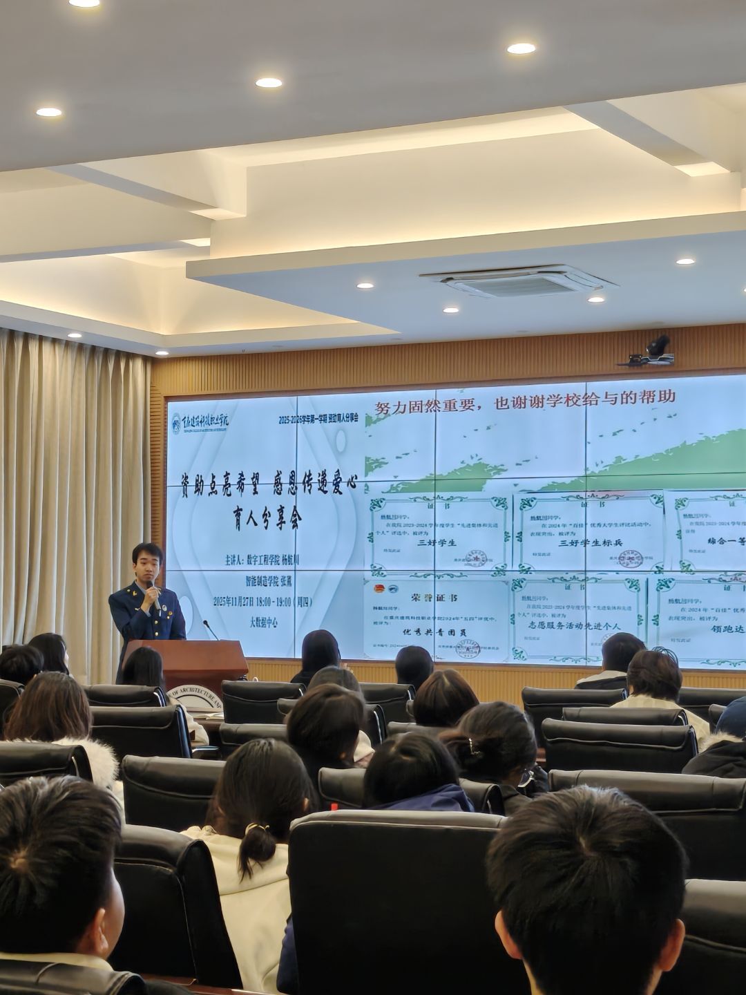 2025.11.27日,“一站式”学生社区开展了一场以“青春逐光,奋力筑梦”为主题的学生分享会。来自23级智能机器人技术一班的张薰同学和曾服役于空军的杨航川同学作为优秀学生代表,分享了他们在大学期间的思想成长、学习奋斗、工作实践与人生选择,展现了新时代青年学子昂扬向上的精神风貌。