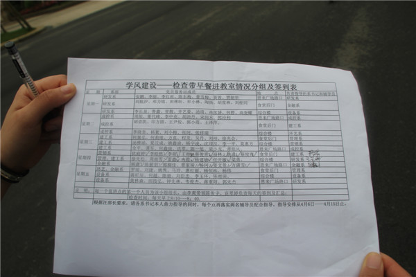 3月下旬,党员服务站接到院党委交办的协助检查带早餐进教室、扭转不良风气的任务后,迅速组织全体成员,分成5个小组,明确了各小组组长,从8:10到8:40,在食堂后门口、恩来广场路口、综合楼梯坎设立了3个执勤点。同时还成立了考勤组,制订了考勤表,落实了考勤人员,仍然是风雨无阻,坚持每天到执勤点逐一由本人亲自签到。