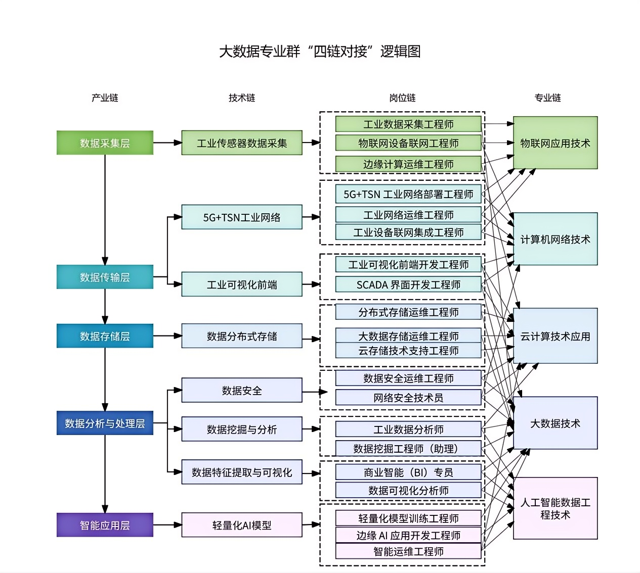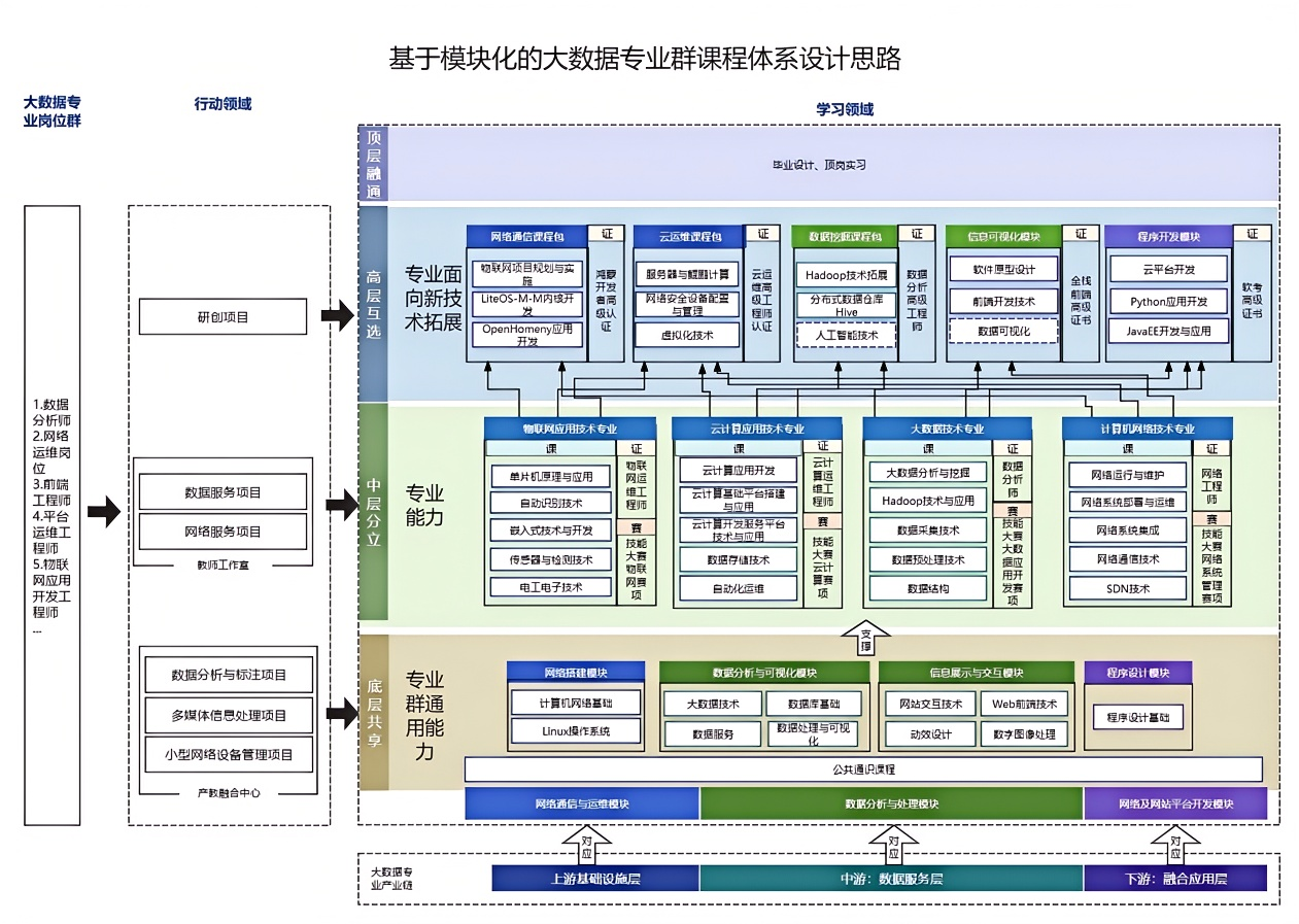 数字工程学院紧扣重庆 “33618” 现代制造业集群与 “数字重庆” 建设需求,以 “服务工业互联网、培育数字工匠” 为核心定位,构建 “产教融合、赛教互促、专创融合” 的人才培养体系。学院以大数据技术专业群为核心,联动物联网应用技术、云计算技术应用、计算机网络技术、人工智能数据工程技术专业,形成 “底层共享、中层分立、高层互选” 的模块化课程体系,精准对接工业数据 “采集 - 传输 - 分析 - 应用” 全产业链;以 “新双高” 建设为引领,联合深圳市讯方技术股份有限公司、重庆翰海睿智大数据科技股份有限公司等企业,纵深赋能现有合作专业、开拓信息技术领域新合作,筑牢专业集群生态企业圈,共建 “产学研训创” 一体化协同育人平台,聚焦数字技术应用创新人才培养,探索实施 “链群对接、岗课融通、分层分类、产学并行、数智融合” 育人模式,通过 “双导师”(企业工程师与校内教师共定方案、共授课程)、“双证书”(1+X 证书高通过率)持续优化培养针对性与适应性。学院以赛促学成效显著,毕业生就业率连续五年超 96%(2024 年达 97%),用人单位满意度 75%,优质就业率 40%,为重庆智能网联新能源汽车、新一代电子信息等产业输送大批技术人才,校企合作、产教融合、数字赋能课程建设等典型案例,获中国教育发展战略学会、重庆市教育委员会等权威认可。