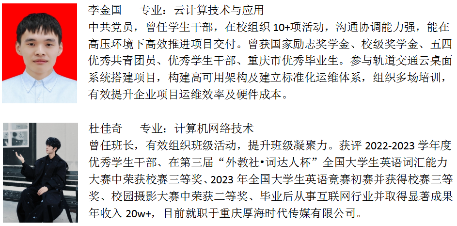 学院以 “岗课融通、产学并行” 育人模式为支撑,毕业生就业率与发展质量稳步提升,涌现出一批技术骨干与创业先锋。我院毕业生广泛就职于互联网科技、数字经济等领域龙头企业,在大数据开发、物联网运维、云计算服务等岗位崭露头角。多人入职华为生态企业、华合数智等知名机构,多名学生在本科院校继续深造,实现学历与技能双提升。同时,依托 “引企驻校” 孵化机制,学生团队通过工匠工坊参与商业项目,单次项目盈利近万元,展现强劲创业潜力。