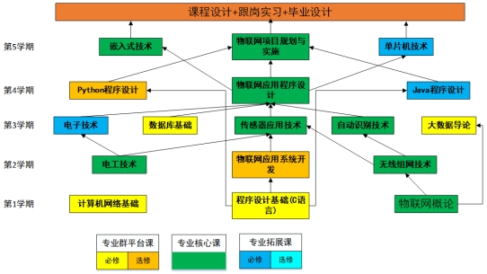 本专业以物联网核心专业技术为主干课程,重点突出嵌入式开发、物联网综合布线能力和物联网弱点工程部署技能的培养。以物联网运维工程师为核心能力,构建了完善的理实一体课程体系。突显实战化、技术前沿性、教师团队优、教学模式好和技能认证强的专业课程特点。