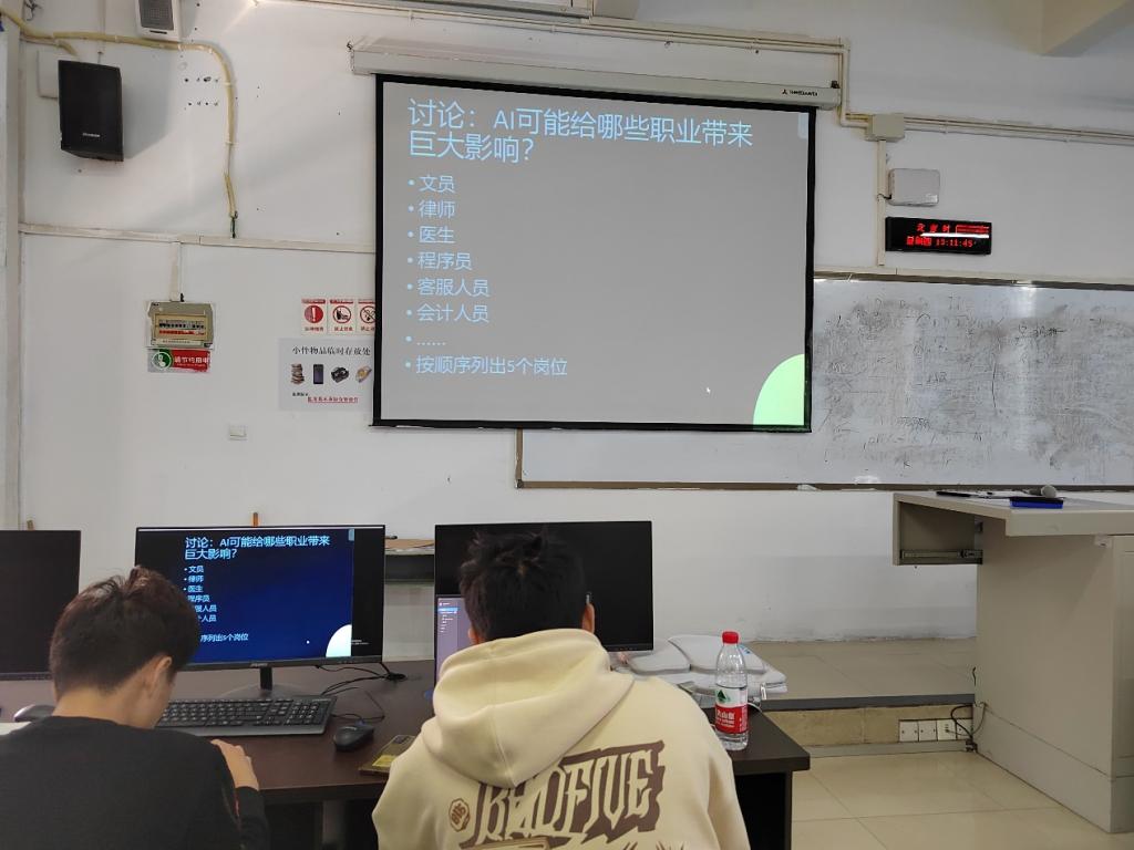 然后,卓老师组织学生们围绕“AI时代最先消失的岗位有哪些”等话题展开了讨论。在讨论中,学生们积极发表自己的看法和见解,互相交流,碰撞出了很多火花。