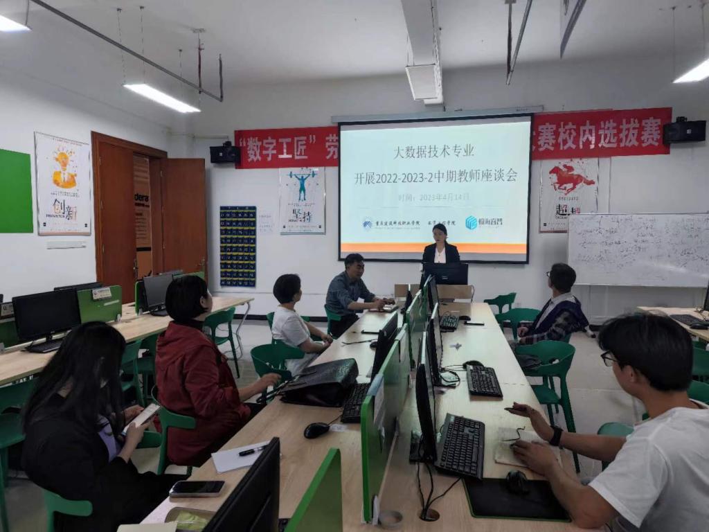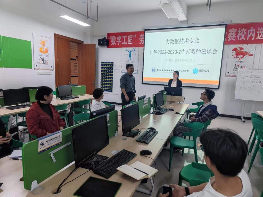为进一步提高教学管理水平,便于我院教师间交流教学心得,及时沟通教学中的问题,优化校企合作办学内容,提升校企合作办学质量20234月14日我院大数据技术教研室在科技楼X406教室开展了大数据技术专业中期教师座谈会数字工程学院院长唐国坪大数据技术专业全体教师、企业代表黎浩、辅导员谢升凤和董媛出席此次座谈会本次会议由教研室主任廖国敏主持