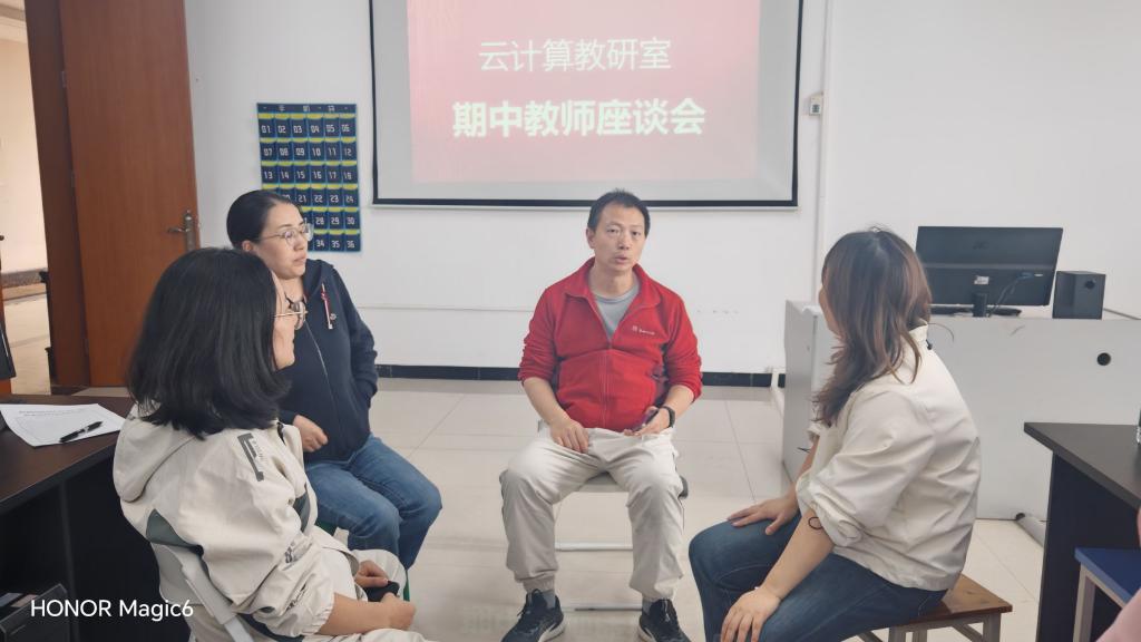 2024年10月30日,云计算教研室召开面向计算机网络及云计算技术与应用专业的2024-2025年度第1学期期中教师座谈会,重点针对两个专业23级学生的学习现状和22级毕业设计工作推进及答辩工作部署在X507教室进行了讨论,会议由潘越老师主持,教研室专业教师冯赟、钱安利、王兴亚,深圳讯方技术股份有限公司余尧、刘和明参会,教研室主任吴泽宇在线指导。