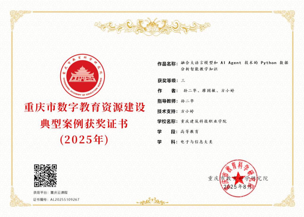 日前,重庆市数字教育资源建设典型案例评选结果揭晓,beat365官方网站与重庆翰海睿智大数据科技股份有限公司联合申报的数字化教学项目《融合大语言模型和AI Agent技术的Python数据分析智能教学知识》荣获三等奖。该项目以人工智能技术为核心,通过校企协同开发的“翰海智言智能教学应用平台”,打造了具有前瞻性和实践性的数字化教学解决方案,为职业教育智能化转型提供了有力支撑。