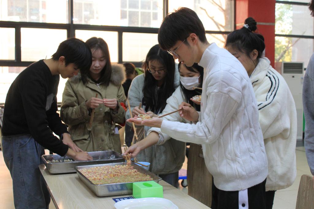 在活动过程中,同学们分工合作,将包饺子的食材准备好后,围坐在一起包饺子。学院院长唐国坪、书记张运来也亲切地融入到包饺子的队伍中,尽管有一些同学不会包饺子,但是在老师、同学的引导下开始慢慢地尝试。大家包的饺子花样繁多,有敦实厚重的,有别致精巧的,还有四不像的,所有人都完全融入进了包饺子的开心氛围中。活动现场欢声笑语,热闹非凡,大家忙得不亦乐乎,好像一家人一样其乐融融。经过两个多小时的努力,包出一排排独具特色的饺子,一盘盘热气腾腾的饺子出锅,大家吃着自己包的饺子,每个人的脸上都洋溢着欢乐笑容。另外,同学们还为未到场参加活动的老师、同学们准备了打包盒,让他们在寒冷的冬天能够吃上热腾腾的饺子。