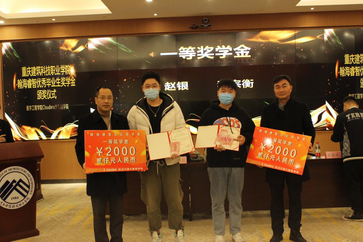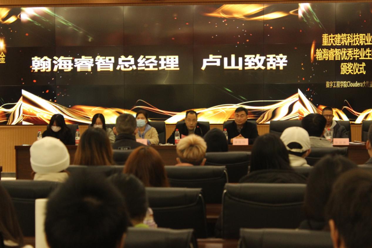 在现场观众的掌声中,主持人宣读Cloudera大数据学院第一届优秀毕业生奖学金颁发文件,数字工程学院领导与重庆翰海睿智企业领导及代表为19级优秀毕业生颁发翰海睿智企业奖学金。