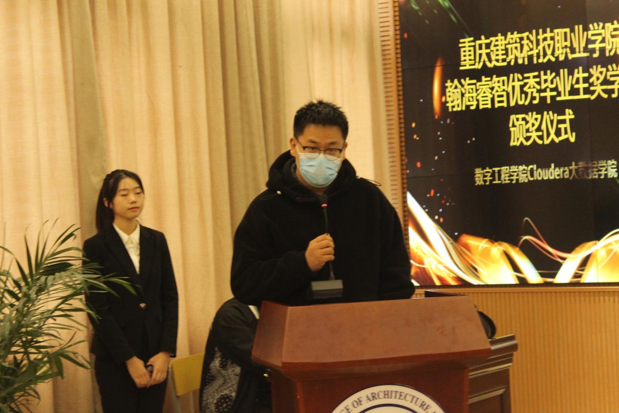 随后,19级学生代表王力同学分享成长感悟。王力同学分享了大学三年的成长经历,总结了自己的不足和收获;感谢了Cloudera大数据学院对学生的精心栽培和翰海睿智企业提供的优良平台,让自己和同学们拥有了更多的锻炼机会;展望了毕业以后的规划,望每一名同学归来仍是少年。