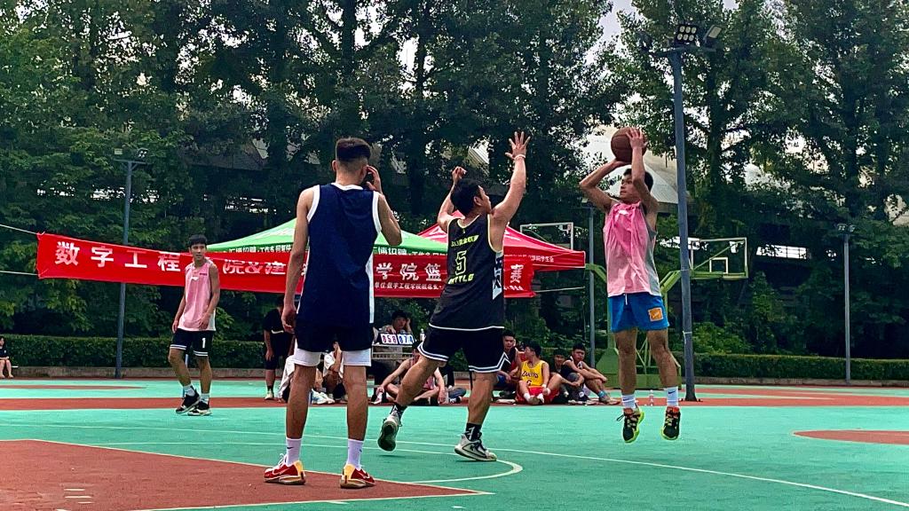 在比赛正式开始前,数字工程学院团总支·学生会书记樊得旺两院篮球友谊赛致词,他强调希望同学们在赛场上全身心投入、全力以赴,将“友谊第一比赛第二”的精神发挥到赛场上。随着裁判哨音吹响,比赛正式开始。运动员们赛出风格,赛出水平,即便头顶烈阳,但仍然充分展现出同学们良好的精神面貌和全面的优秀素质,现场氛围紧张且热烈。场外的观众为他们擂鼓、呐喊、助威!裁判员严肃认真,保障比赛的公证性。