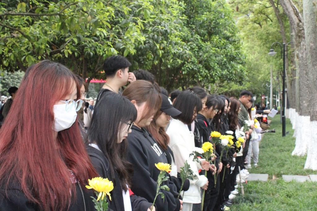 在庄严肃穆的氛围中,全体同学在烈士墓前庄严肃立,向革命烈士默哀鞠躬,并敬献鲜花。