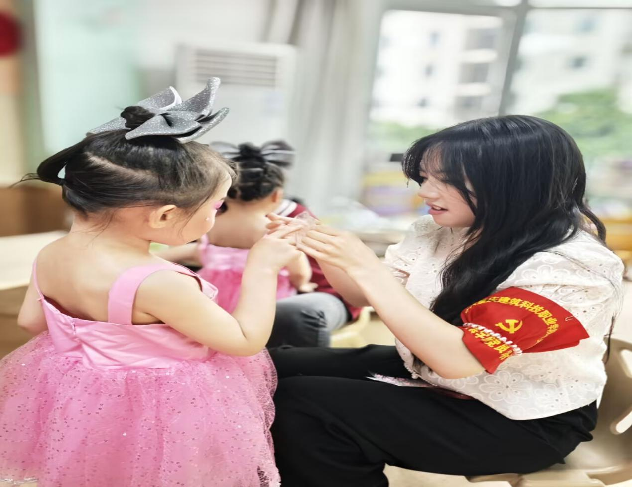 除了为孩子们化妆,志愿者们还积极与孩子们亲切互动,趣味小游戏轮番上演,幼儿园内充满了欢声笑语。志愿者们蹲下身子,耐心倾听孩子们的奇思妙想,与他们一起畅想六一表演的精彩瞬间,给予孩子们满满的鼓励与支持,让他们对即将到来的演出充满憧憬。