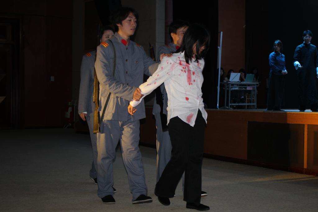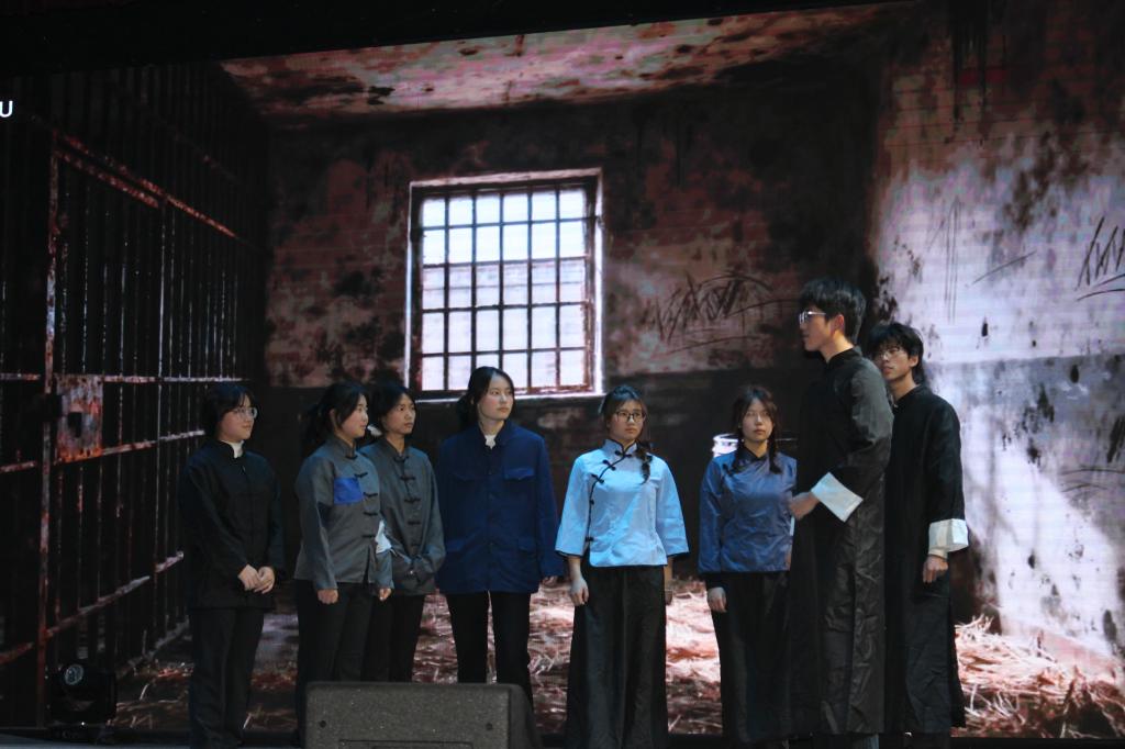 舞台剧的焦点随后转向傅伯雍入狱后的英勇抗争:随着场景切换至渣滓洞监狱,演员们以极具张力的表演,还原了因叛徒出卖而身陷囹圄的傅伯雍,面对敌人严刑拷打与威逼利诱时始终坚守信仰、坚贞不屈的壮烈场景。表演中,既有傅伯雍在狱中与战友们通过眼神、暗号秘密传递信念的细腻刻画,也有他以生命践行初心的铿锵抉择,让现场师生深刻感受到红岩英烈“威武不能屈”的崇高气节。
